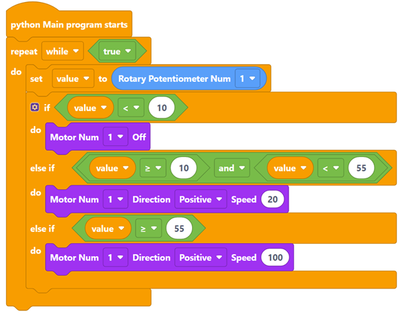 Then, based on the value of the rotary potentiometer, the motor speed control is completed. When the value of the rotary potentiometer is greater than or equal to 10 and less than 55, the motor turns forward at a speed of 20. When the value of the rotary potentiometer is greater than or equal to 55, the motor turns forward at a speed of 100. The example code is as follows:
