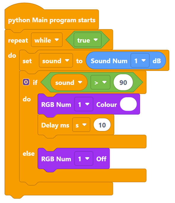 Then, check the normal ambient sound decibel value on the main controller, obtain the threshold for sound control, and control the RGB lights to turn on and off. The example code is as follows: