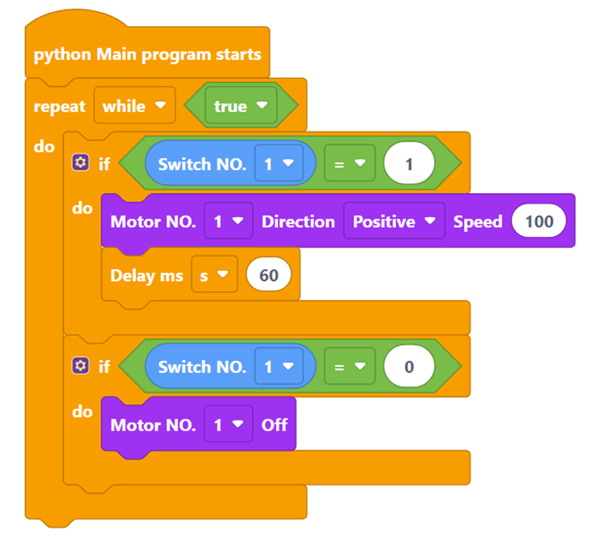 Then, when the switch is turned on, programming is implemented to rotate the motor and switch the sensor. Every time the sensor is pressed, the motor rotates for 1 minute. The example code is as follows: