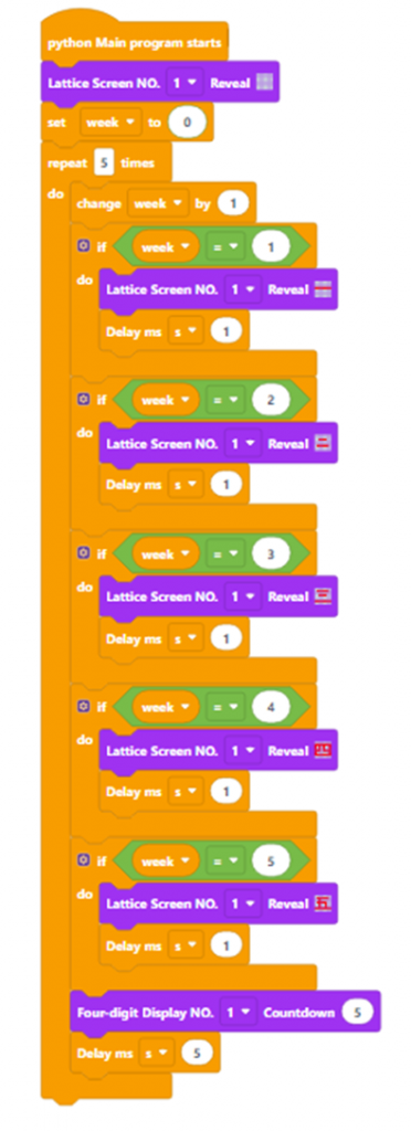 Then, create the variable ‘week’ with an initial value of 0, and increase its value by 1 every time it is repeated. The example code is as follows: