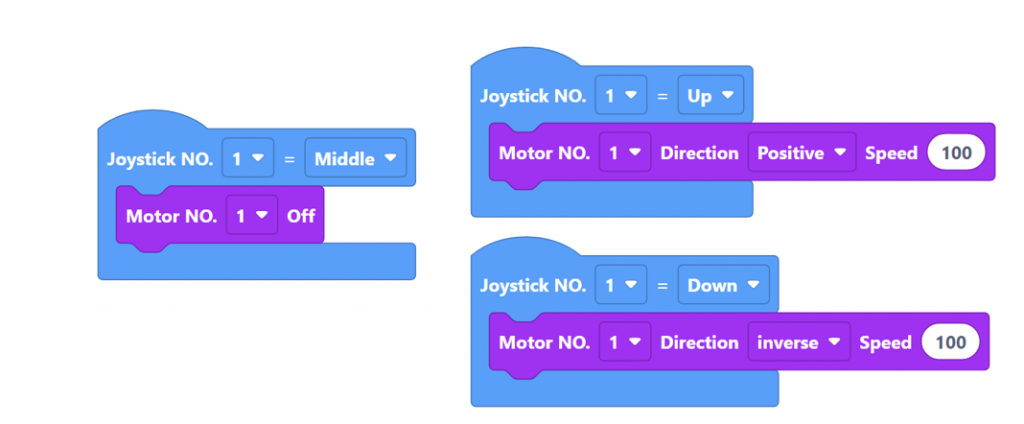 Finally, add the motor rotation statement, with the joystick pointing upwards indicating forward rotation and the joystick pointing downwards indicating reverse rotation. The example code is as follows: