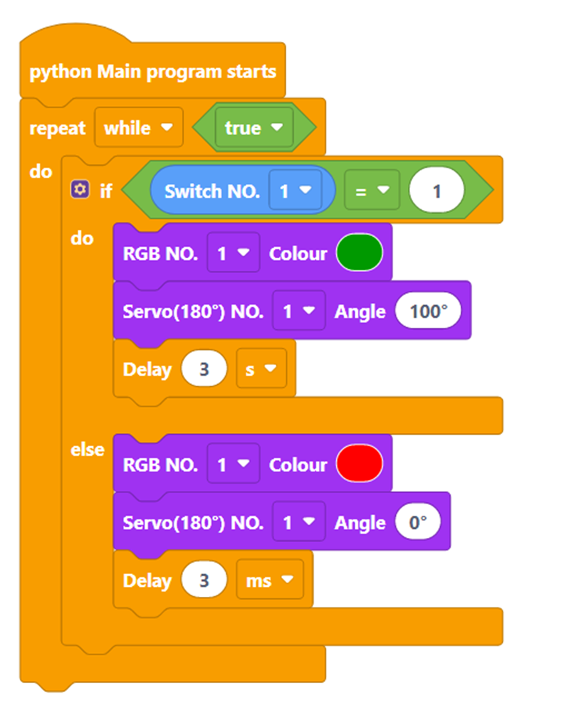 Then, in combination with RGB lights, the green light is on when opening the door and the red light is on when closing the door. The example code is as follows:
