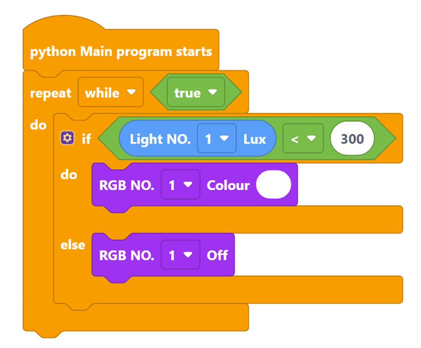 Then it combines the light intensity sensor and RGB lamp to realize the automatic switching of lights. The example code is as follows: