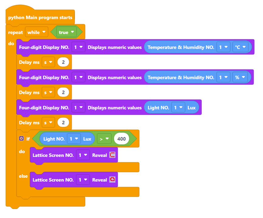 Then, the temperature, humidity and light intensity values are obtained and displayed on the four-way digital tube with a time interval of 2 seconds. The example code is as follows: