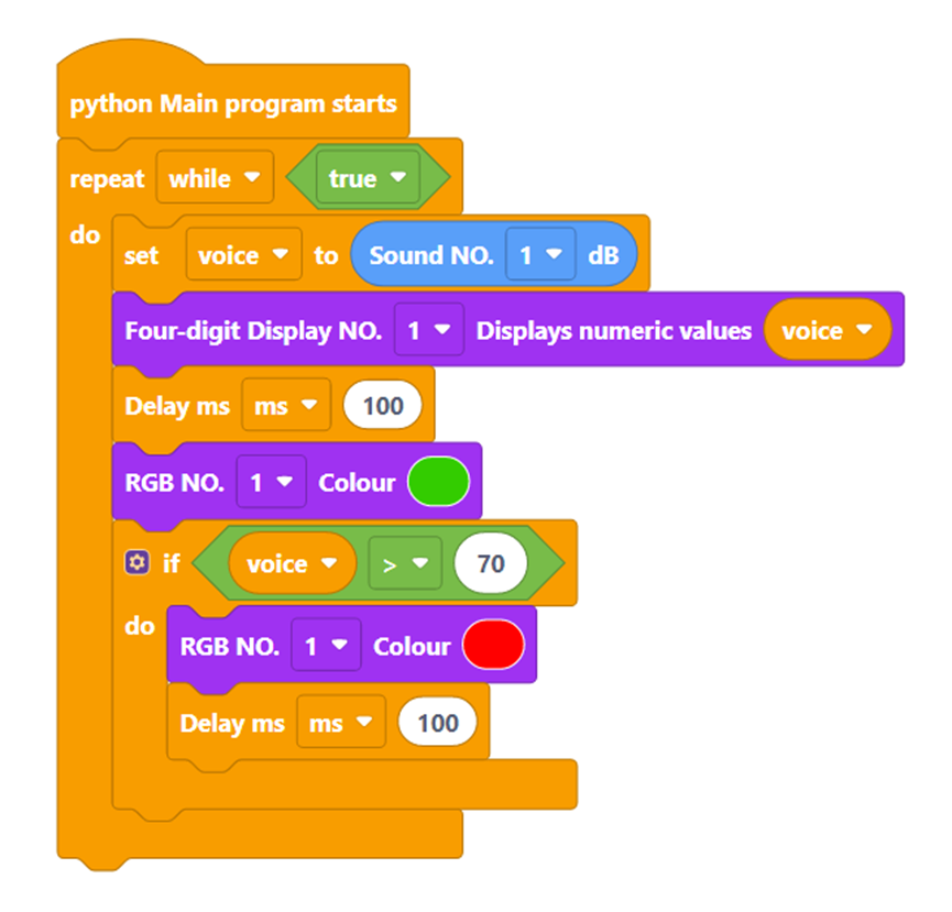Then, set the display interval to 100ms each time, and determine the value of the variable. If the sound exceeds 70db, set the RGB light to red and keep it on, otherwise keep it green. The example code is as follows: